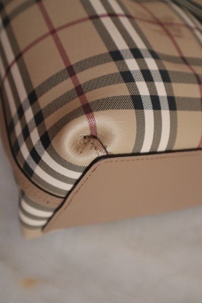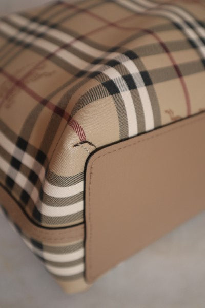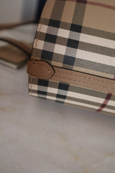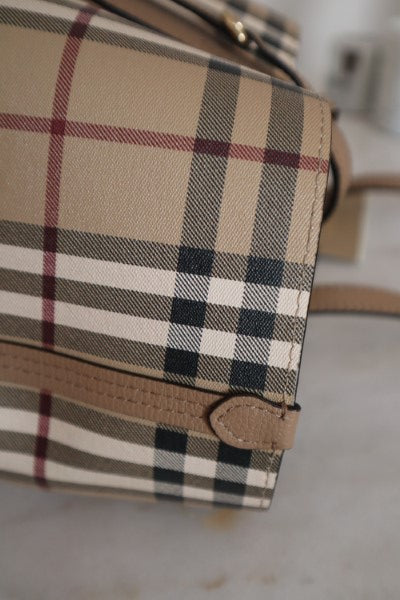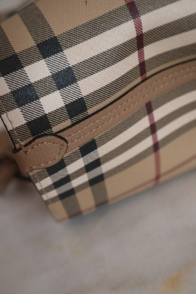 • Material: Beige Haymarket Check Coated Canvas with Leather Trim