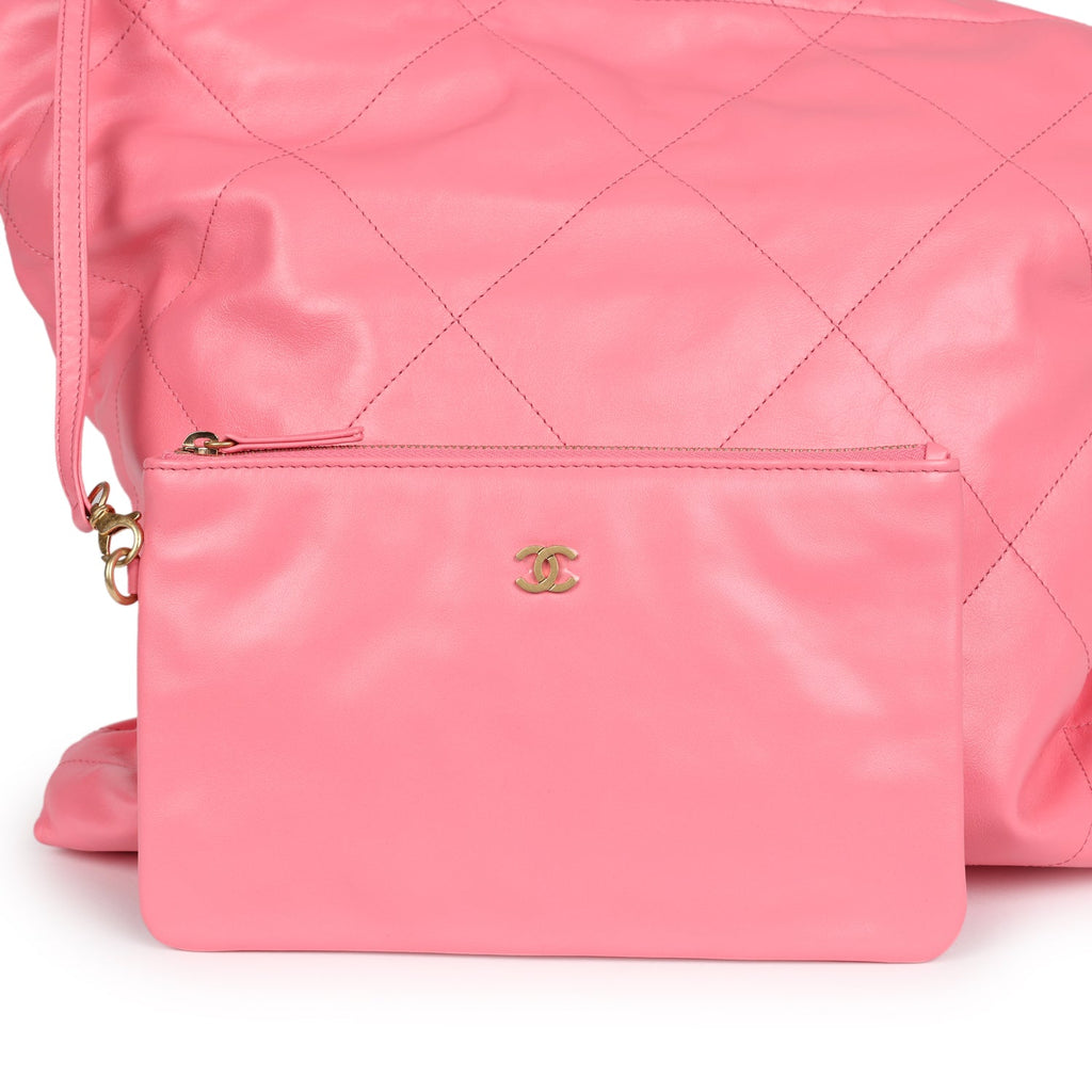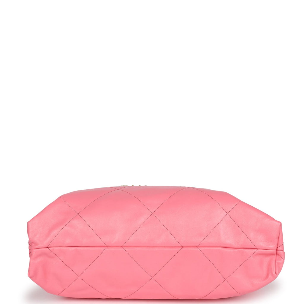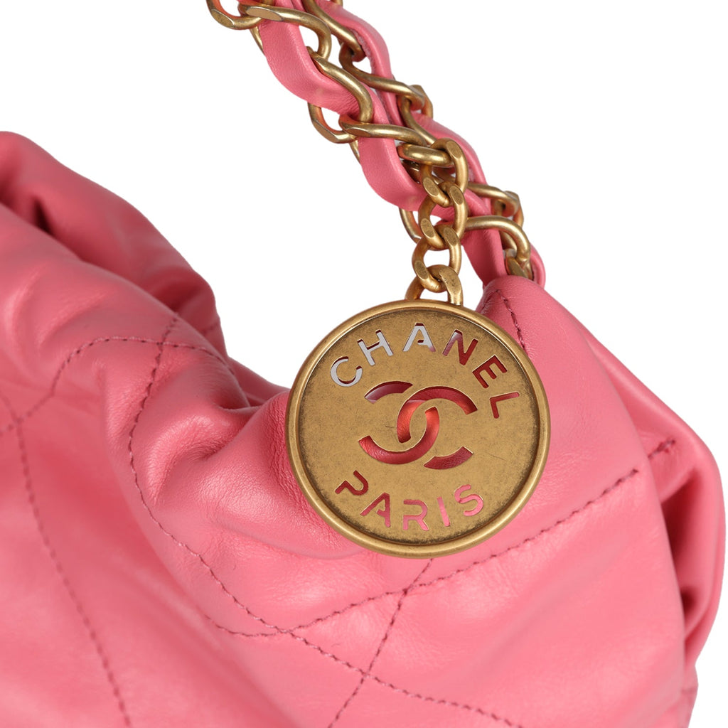 This Small 22 hobo bag is of pink calfskin with gold tone hardware and has the signature diamond quilting, CHANEL on the front in gold metal, removable pouch, and long gold tone and pink leather chain.The interior is lined in pink fabric with one zip pocket on the rear wall.Collection: 22AOrigin: ItalyCondition: New and never wornAccompanied by: MAC dustbagMeasurements: 12″ width x 11″ height x 3.25″ depth; 8″ strap drop