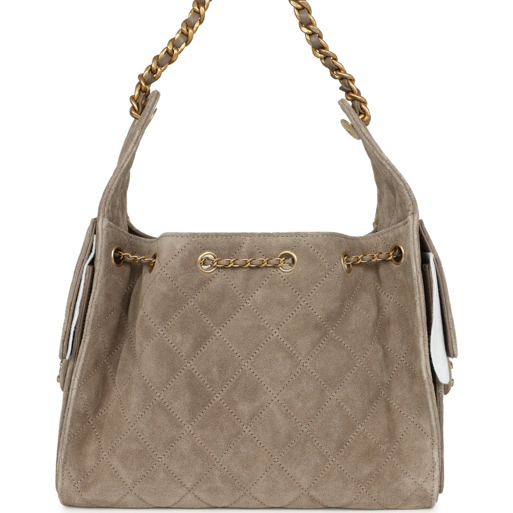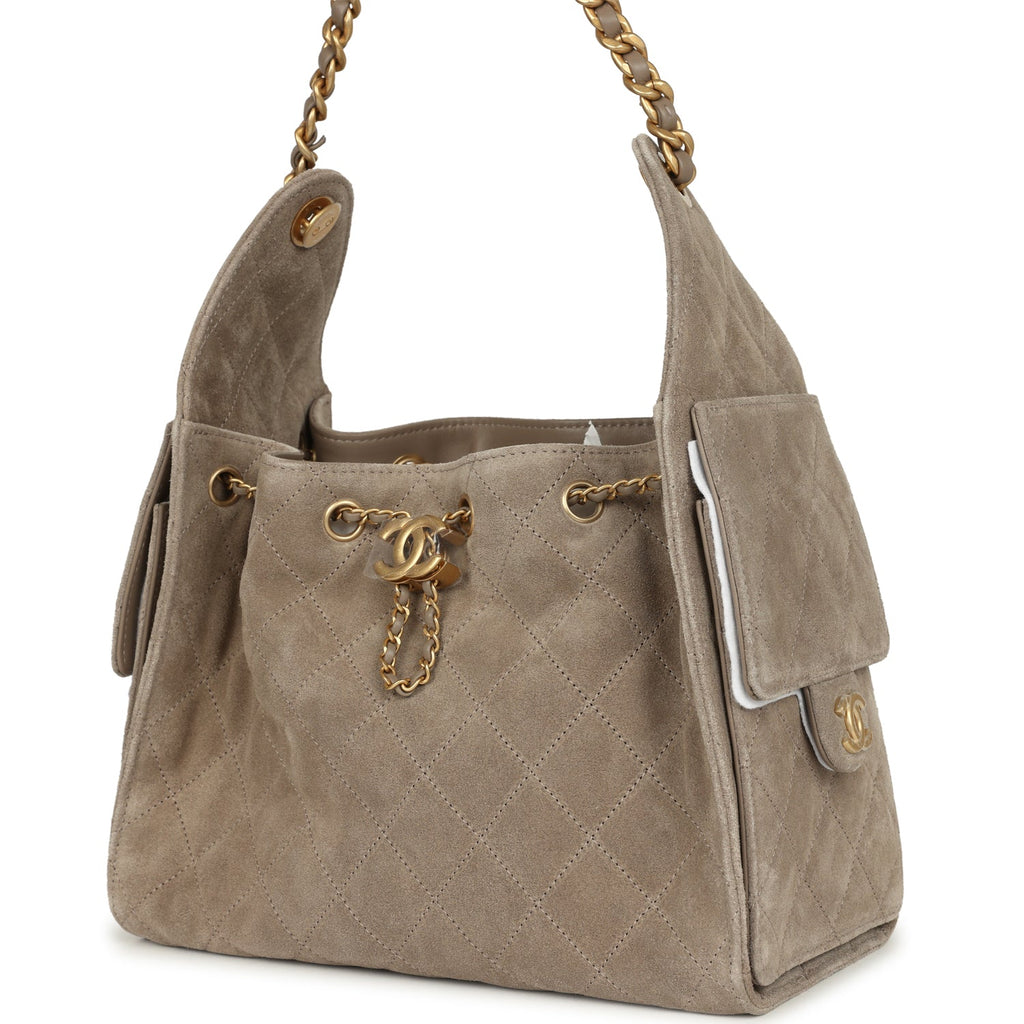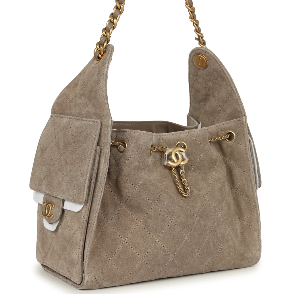 Chanel Small 25 Hobo Bag Dark Grey Suede Antique Gold Hardware Shop for an authentic Chanel Small 25 Hobo Bag in dark grey suede with antique gold hardware in new and never worn condition at Madison Avenue Couture.