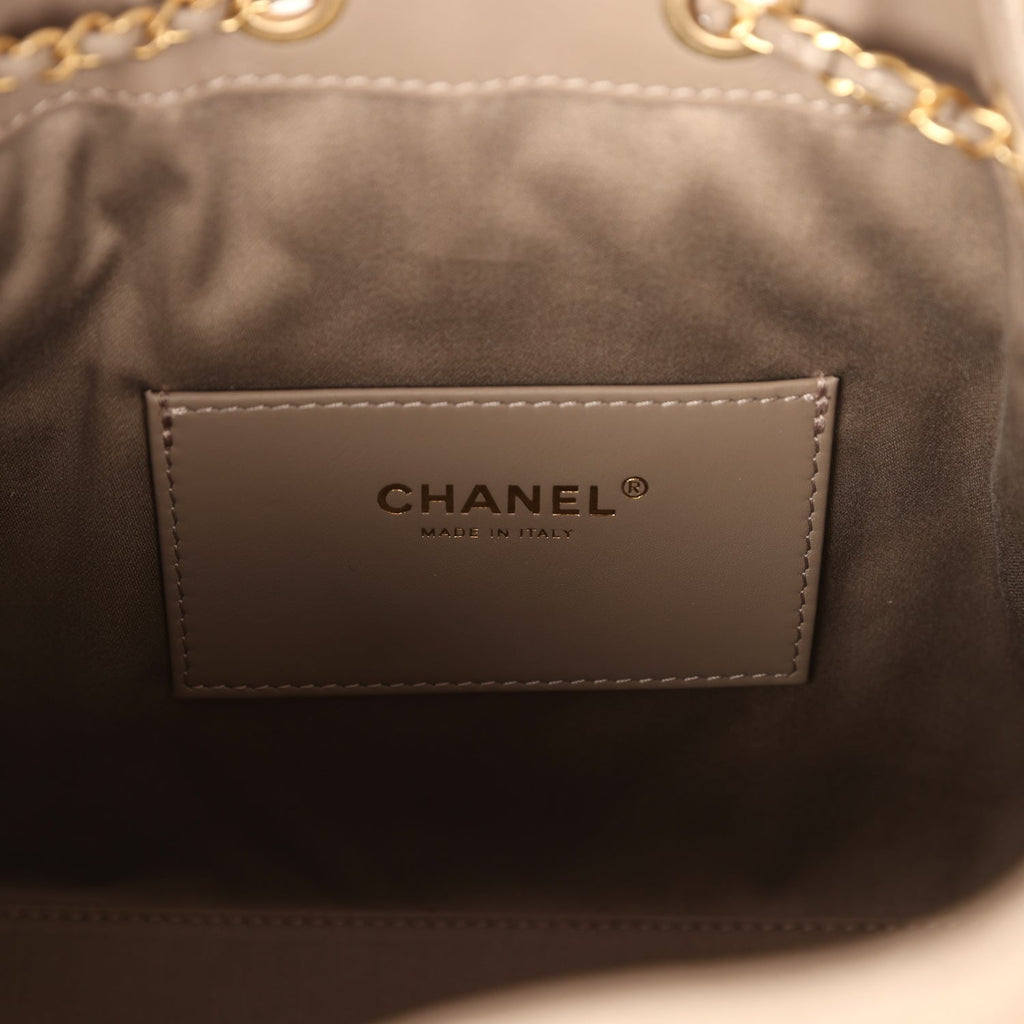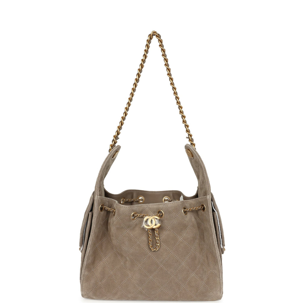 This Chanel Small 25 Hobo Bag is in dark grey suede with antique gold hardware, features signature diamond quilt, two exterior side pockets, drawstring closure, and a single interwoven Antique gold and dark grey leather shoulder strap.The interior is lined in dark grey grossgrain fabric and has three small slit pockets; one on the rear wall and one slit pocket on each interior side.Collection: 25K (RFID chip)Origin: ItalyCondition: New and never worn (plastic on CC hardware)Accompanied by: Chanel box (split lid), Chanel dustbag, two side pocket felts, RFID chip, ribbon, retail UPCMeasurements: 10.5″ width x 8″ height x 4.5″ depth; shoulder strap drop: 12″