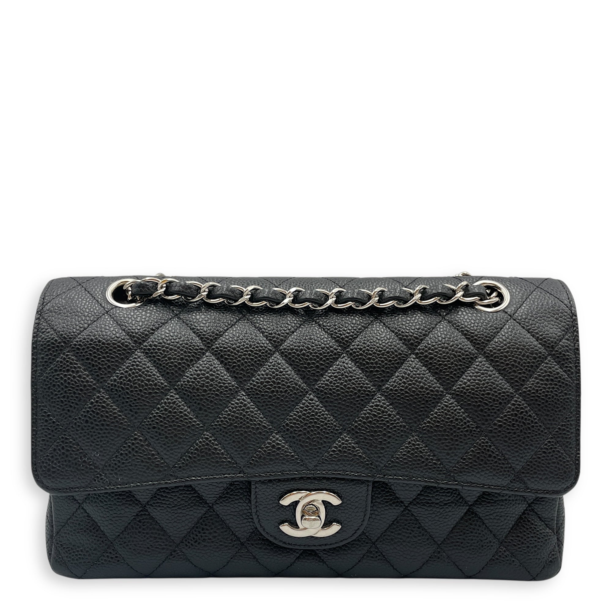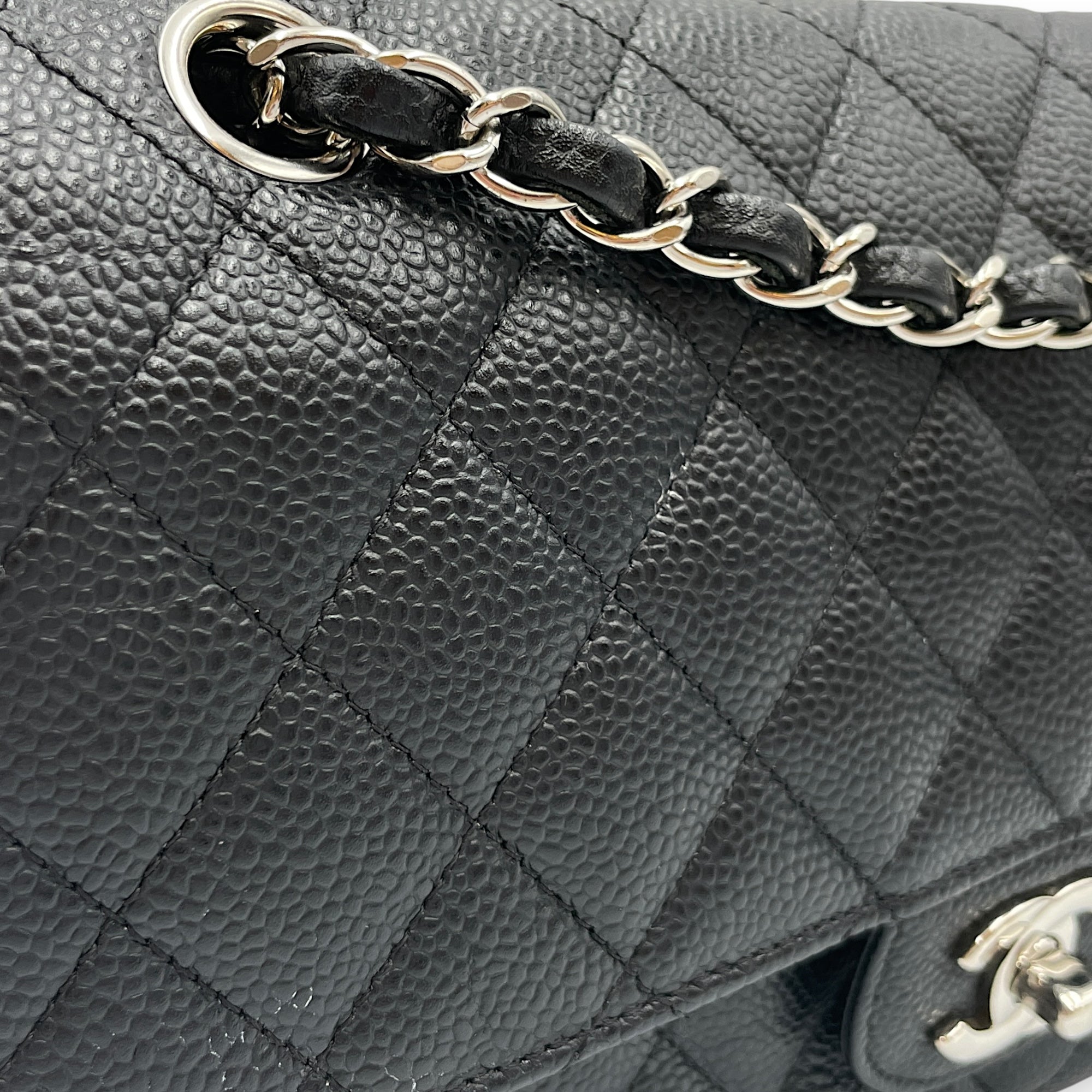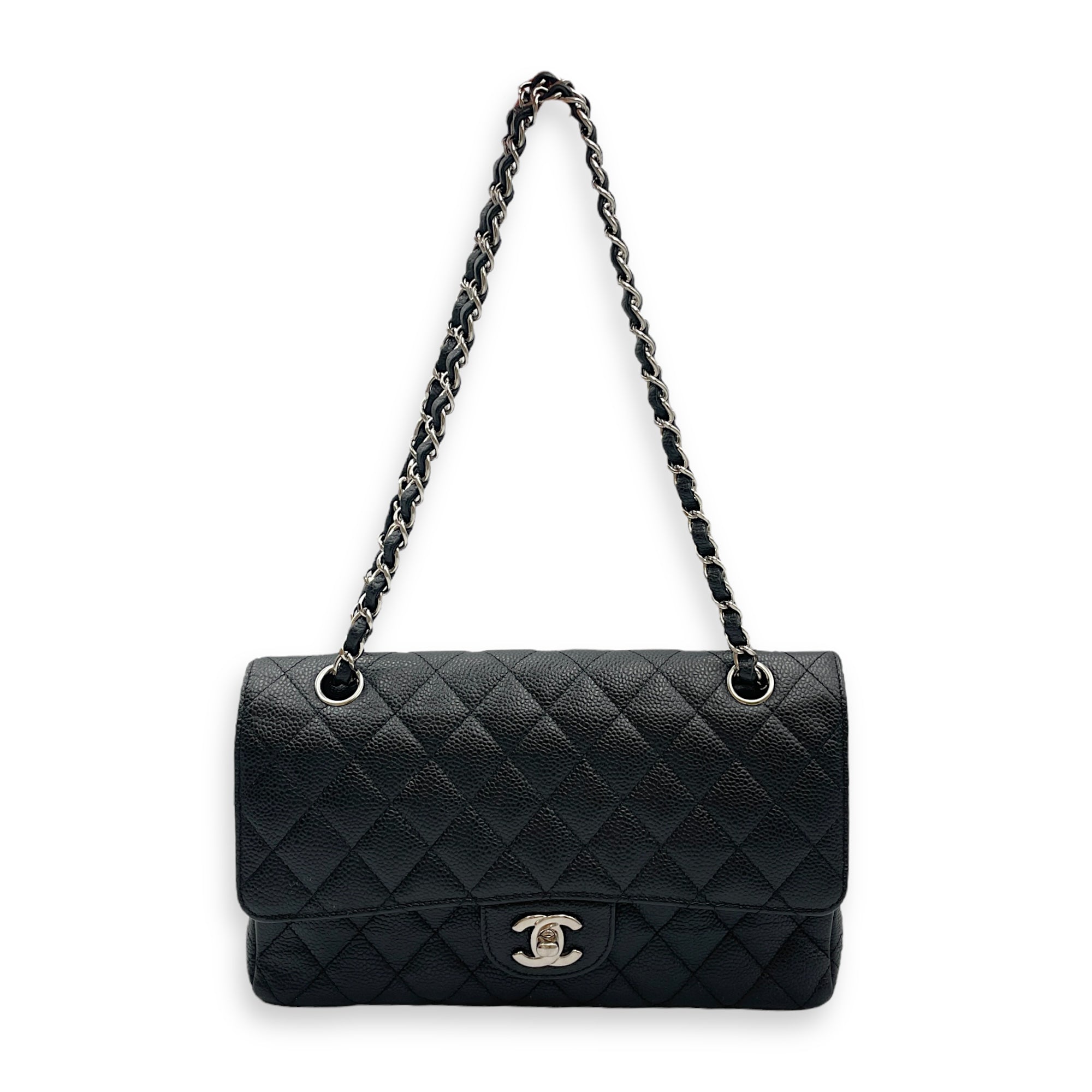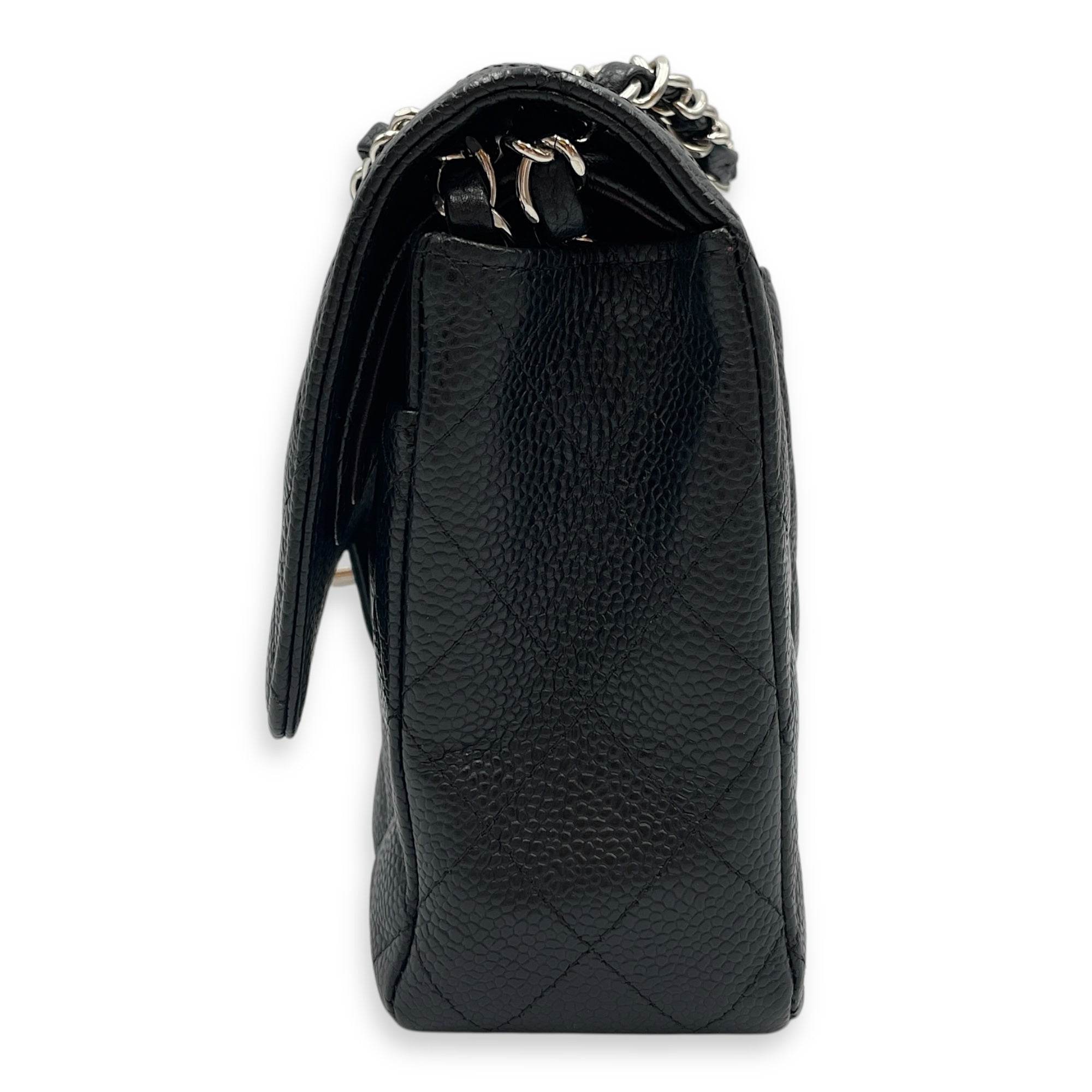 Classic Medium Black Double Flap Bag in Caviar Leather, Silver hardware