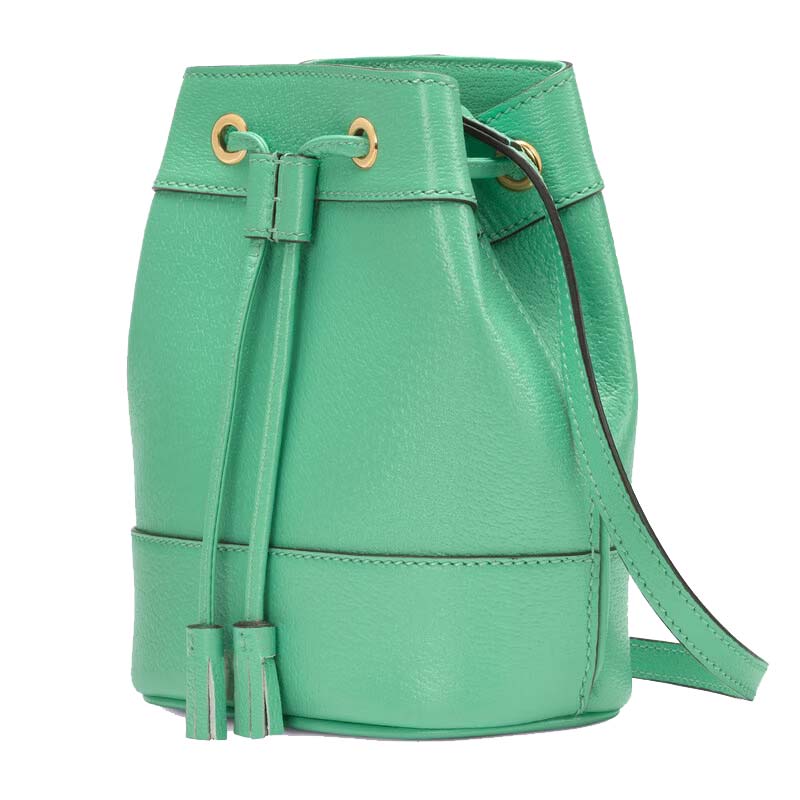 The Ophidia bucket bag Crafted in soft mint leather with tonal trims and drawstring, the accessory is completed with an adjustable shoulder strap.