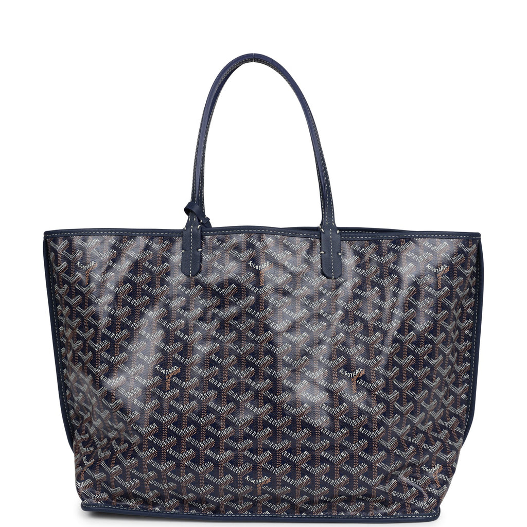 This Goyard Anjou PM bag is in navy Goyardine canvas with palladium hardware, contrast stitching, navy chevroches calfskin lining, and a detachable pouch.This bag is reversible.Origin: FranceCondition: New and never wornAccompanied by: Goyard dustbag, retail UPC, removable pouchMeasurements: 18.5″ x 11″ x 5.9″;  handle: 7.5″