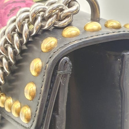 • Material: Black Calfskin Leather with Multicolor Embroidered Flower Details and Studs