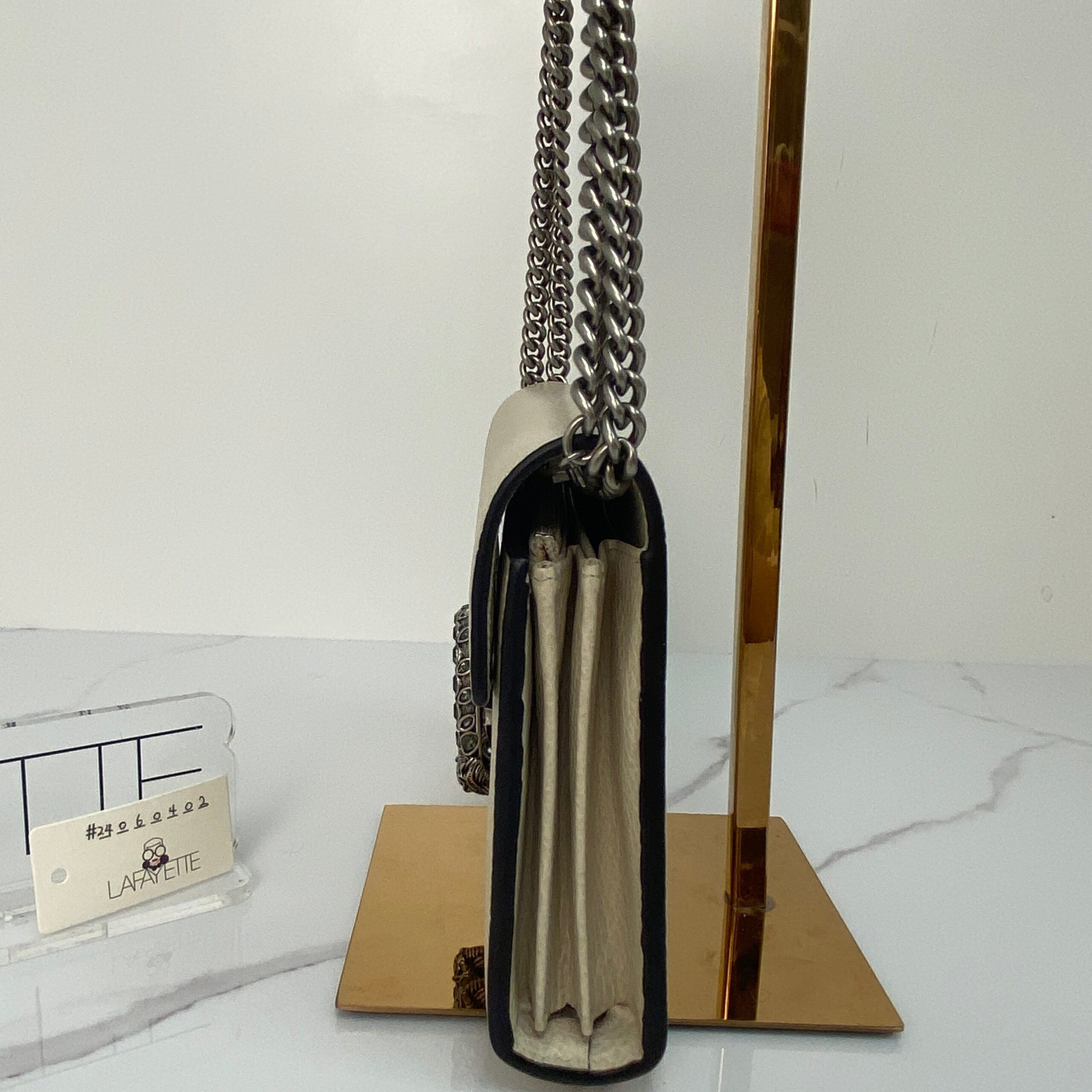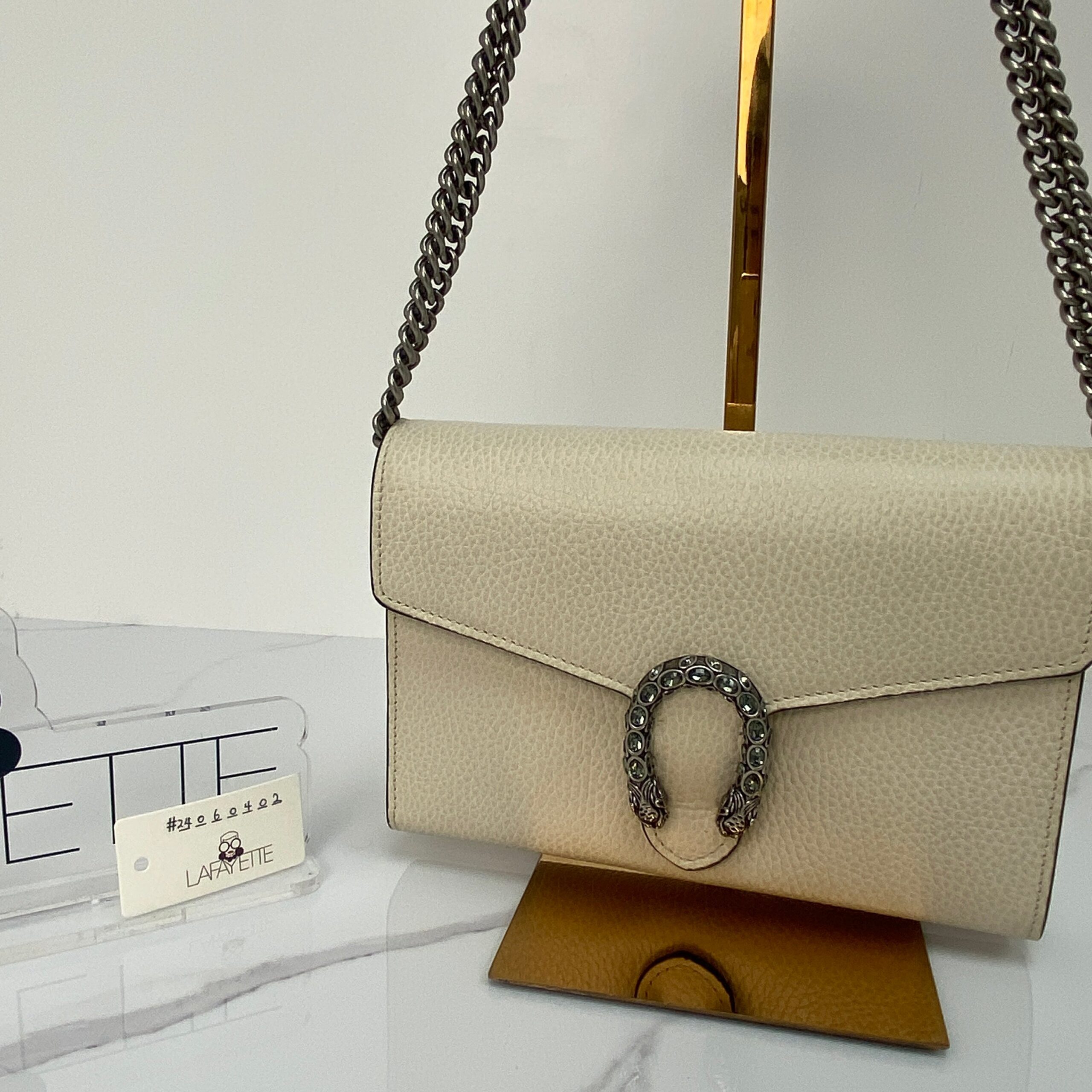 Step into the spotlight with the Gucci Dionysus Mini Leather Chain Wallet, a stunning piece crafted from luxurious white calfskin. This little gem combines elegance with an edgy twist, thanks to its signature tiger head clasp. Perfectly petite and undeniably chic, it’s like carrying a touch of Greek mythology and modern glam all in one!