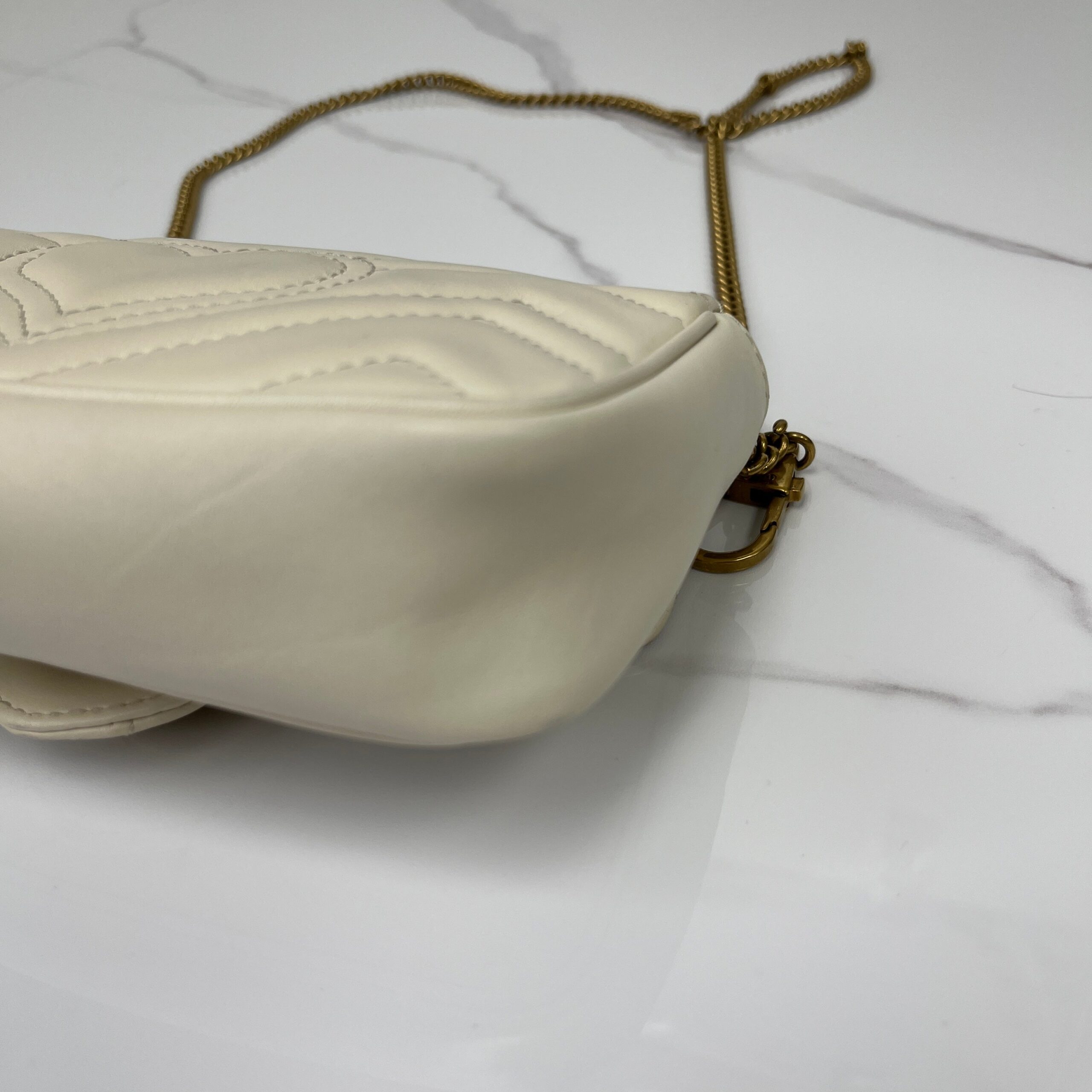 Sling this chic white Gucci Marmont Super Mini over your shoulder for your next night out. Its compact design packs a punch, fitting all your essentials with ease, while its classic style adds a touch of timeless elegance to any outfit.