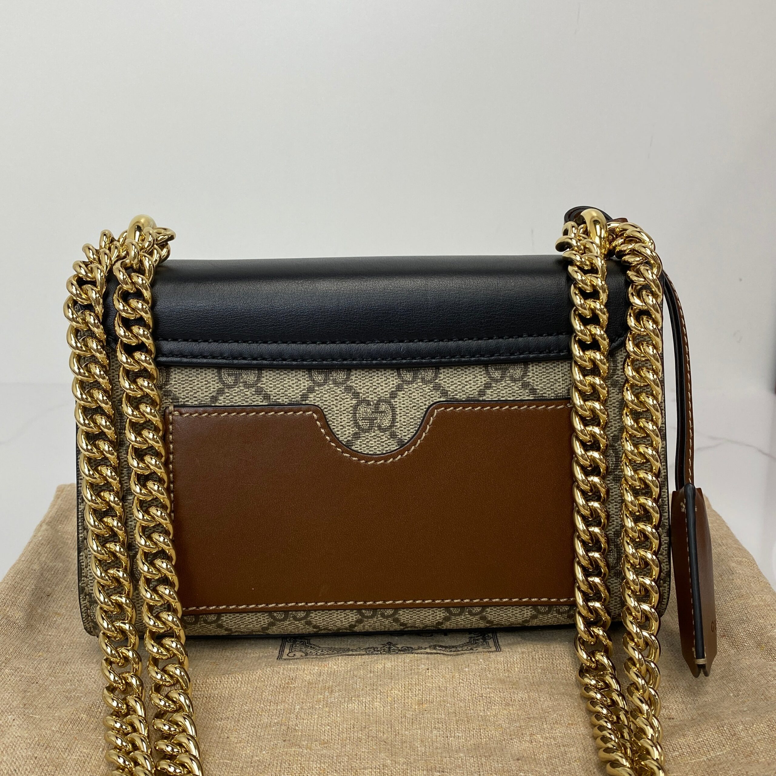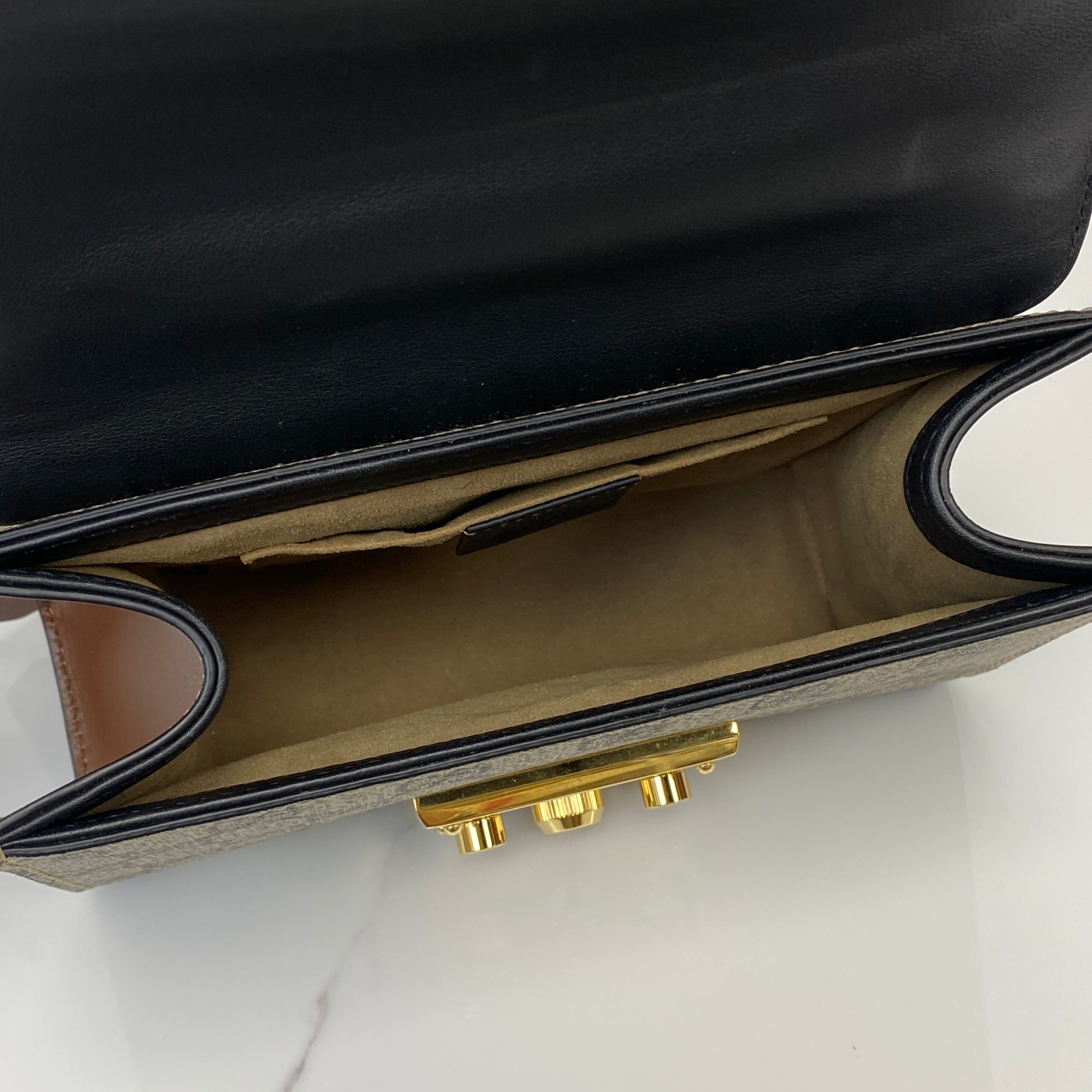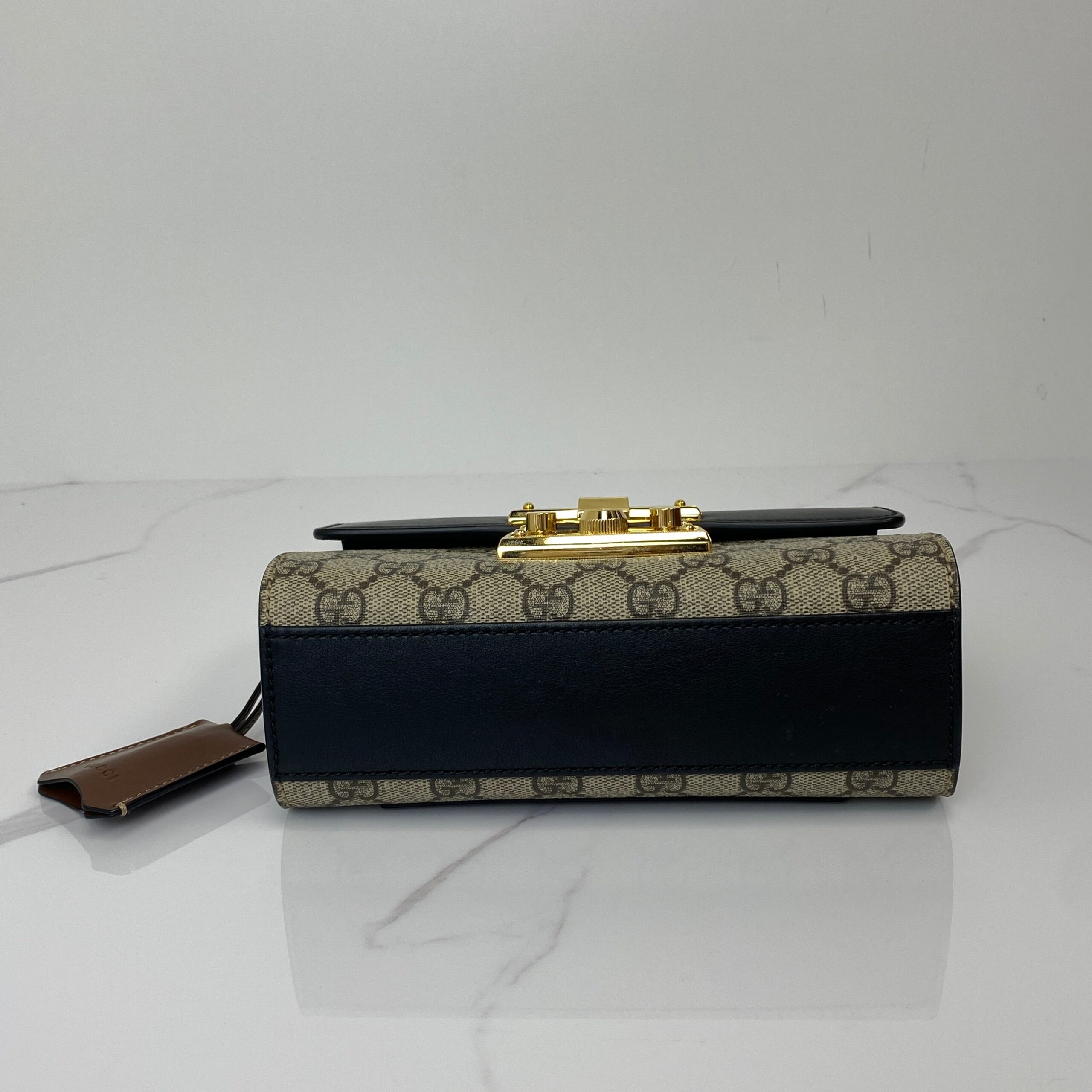 The Gucci Padlock Small Shoulder Bag in black GG Supreme canvas is the epitome of versatile luxury. Its structured design and adjustable strap make it perfect for both day and evening wear. Whether paired with a tailored blazer or a casual outfit, this bag adds a sophisticated touch to any ensemble.