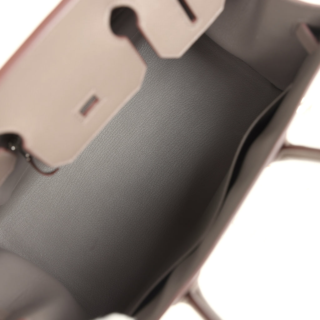 This Birkin is of Etain epsom leather with palladium hardware and has tonal stitching, front flap, two straps with center toggle closure, clochette with lock and two keys, and double rolled handles.The interior is lined with Etain chevre and has one zip pocket with an Hermes engraved zipper pull and an open pocket on the opposite side.Collection: Z (2021)Origin: FranceCondition: Never worn (Plastic on hardware) – minor discoloration to the exterior hardware rivets and a tiny scuff to front flap.Accompanied by: Hermes box, Hermes dustbag, clochette, felt, lock, two keys, clochette dustbagMeasurements: 11.75″ width x 9.5″ height x 6″ depth; 4.25″ handle drop