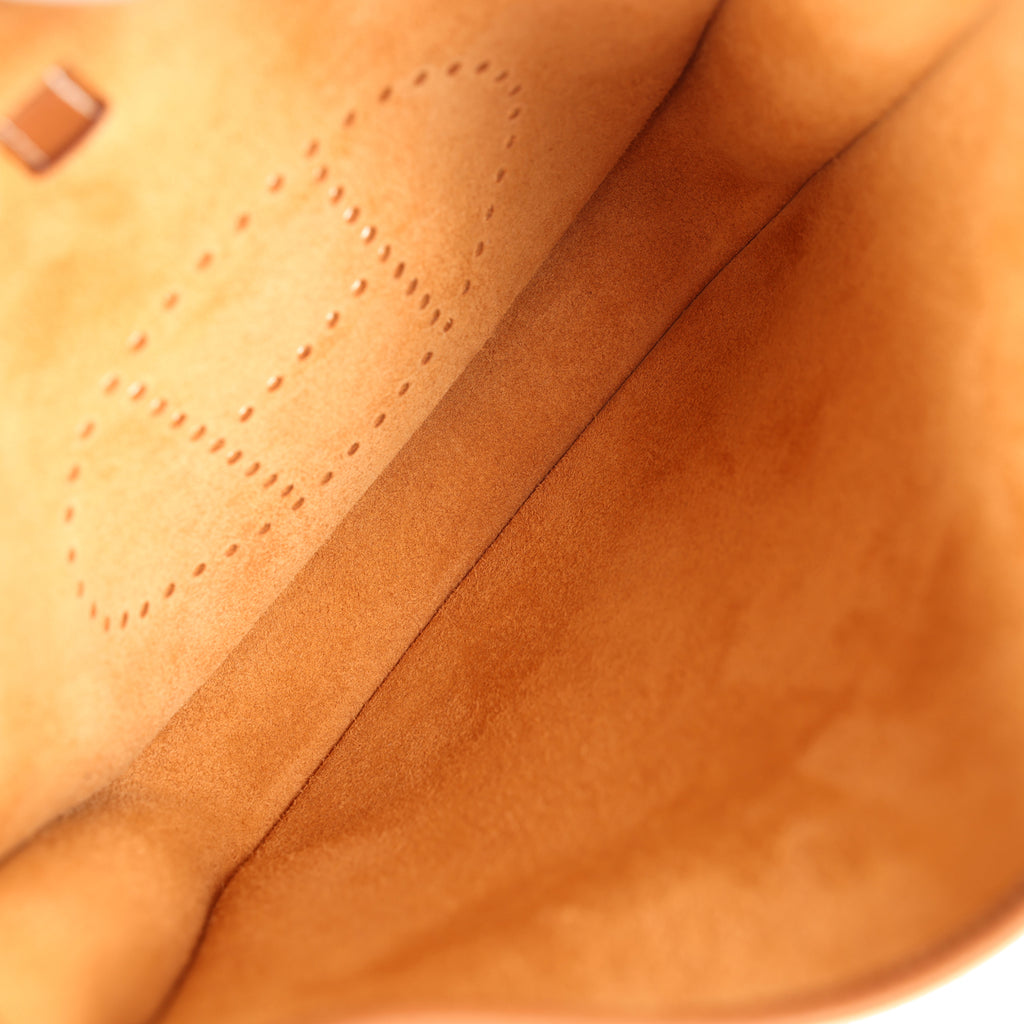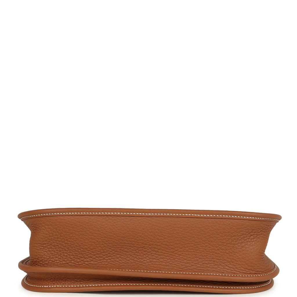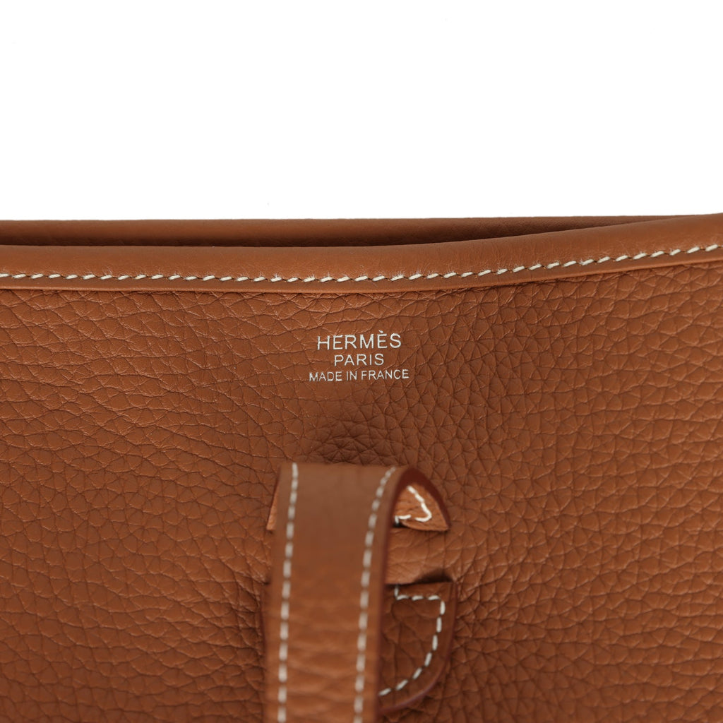 Hermes Evelyne III PM Gold Clemence Palladium Hardware Shop for an authentic Hermes Evelyne III PM in Gold clemence leather with palladium hardware in new and never worn condition at Madison Avenue Couture.