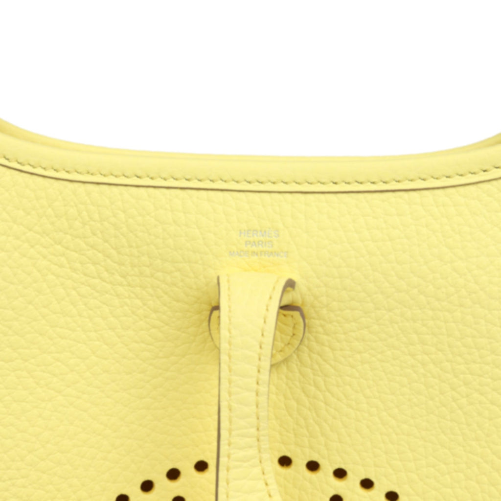 Hermes Evelyne TPM Limoncello Clemence Palladium Hardware Shop for an authentic Hermes Evelyne TPM in Limoncello clemence leather with palladium hardware in new and never worn condition at Madison Avenue Couture.