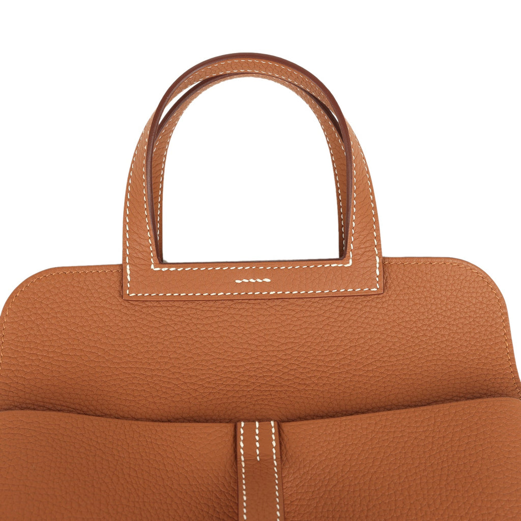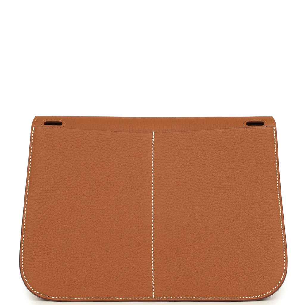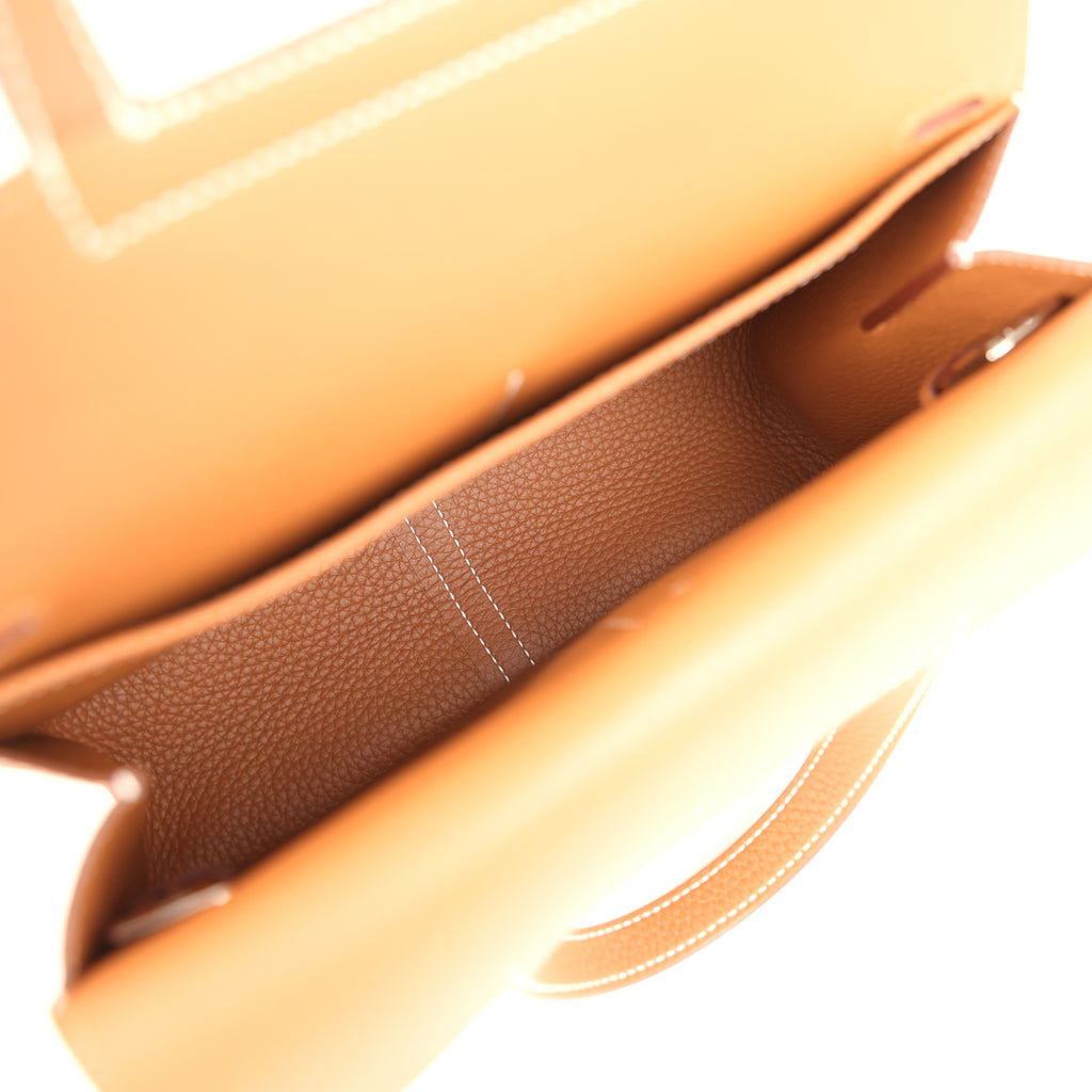 This Halzan 25 bag is in Gold clemence leather with palladium hardware, tonal and contrast stitching, front loop closure, foldable top handles, two front pockets and two back pockets, and a long removable cross body strap for multistyle wear.The interior is lined with Gold swift with one interior slip pocket on rear wall.Collection: Z (2021)Origin: FranceCondition: New and never worn Accompanied by: Hermes box, Hermes dustbag, removable strap, strap dustbag, carebook, ribbonMeasurements: 9.75″ width x 6.25″ height x 3″ depth; 3.75″ handles, 20.25″ strap drop