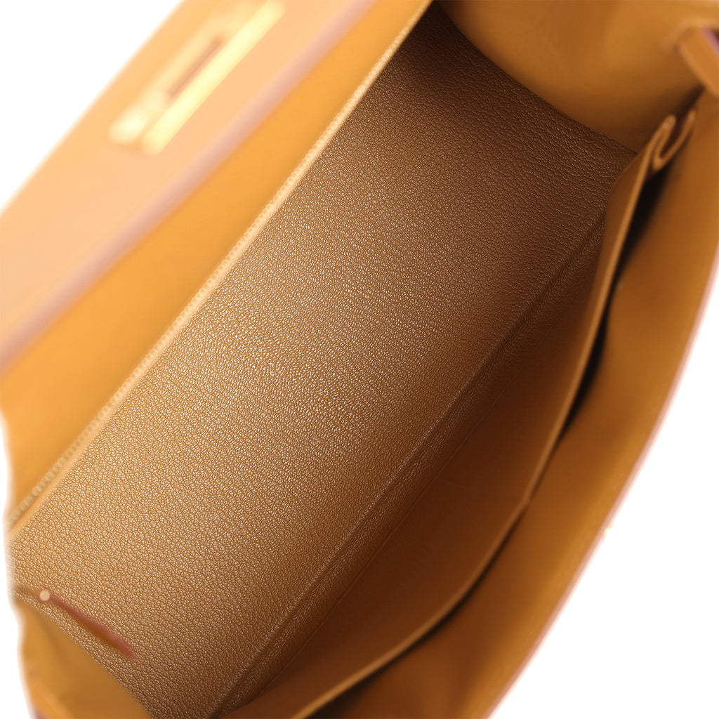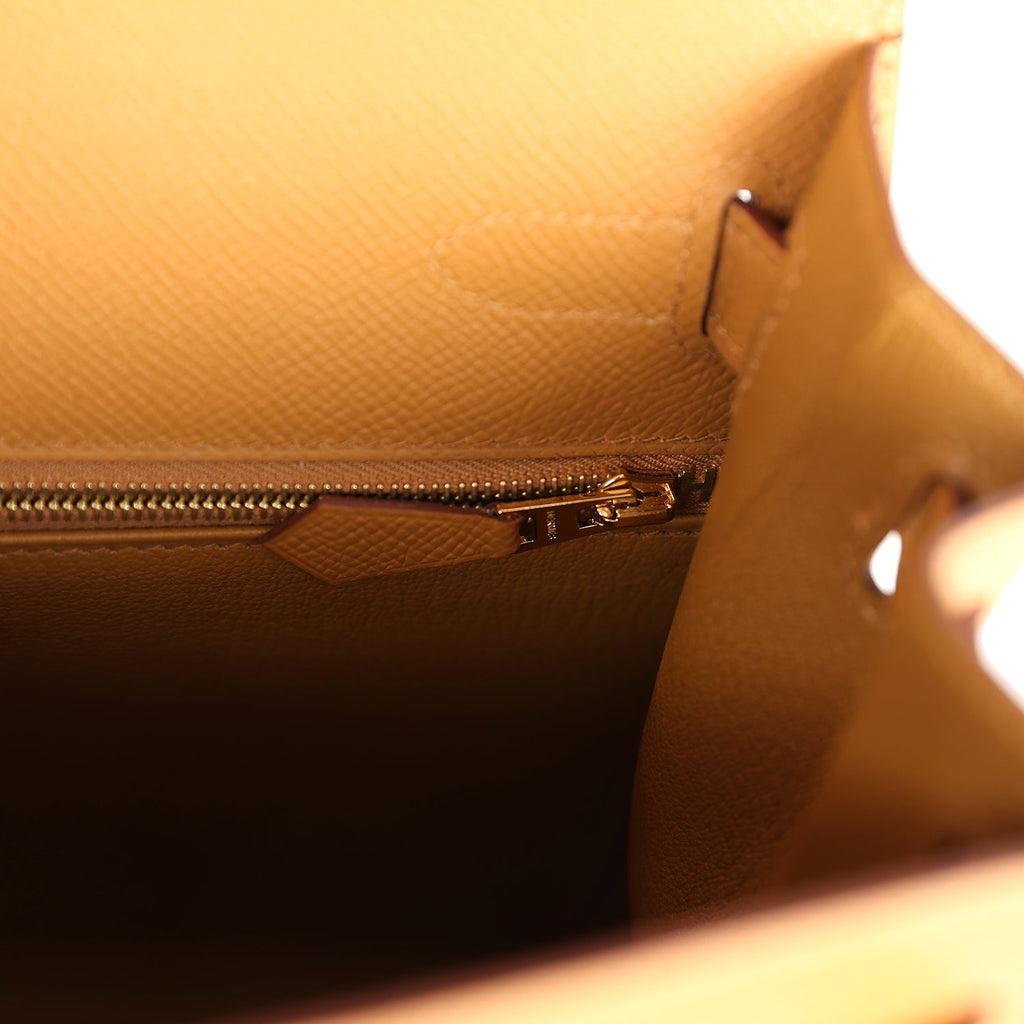 This Kelly, in the Sellier style, is in Sesame epsom leather with gold hardware and has tonal stitching, front flap, two straps with center toggle closure, clochette with lock and two keys a single rolled handle and removable shoulder strap.The interior is lined with Sesame chevre leather and has one zip pocket with an Hermes engraved pull and two open pockets on the opposite side.Collection: B (2023)Origin: FranceCondition: New and never worn (plastic on hardware)Accompanied by: Hermes box, Hermes dustbag, clochette, lock, two keys, shoulder strap, clochette dustbag, shoulder strap dustbag, felt and carebookMeasurements: 11.25″ width x 8.25″ height x 4.75″ depth; 3.5″ handle drop (16.5″ shoulder strap drop)