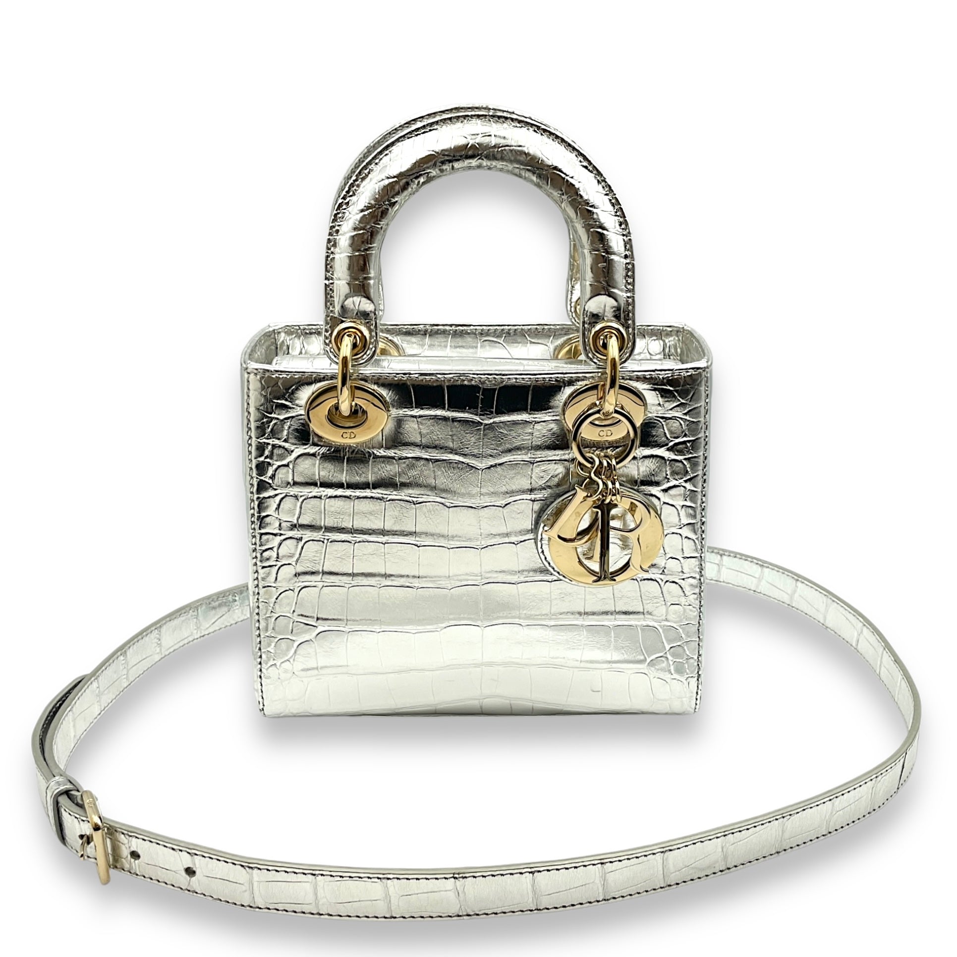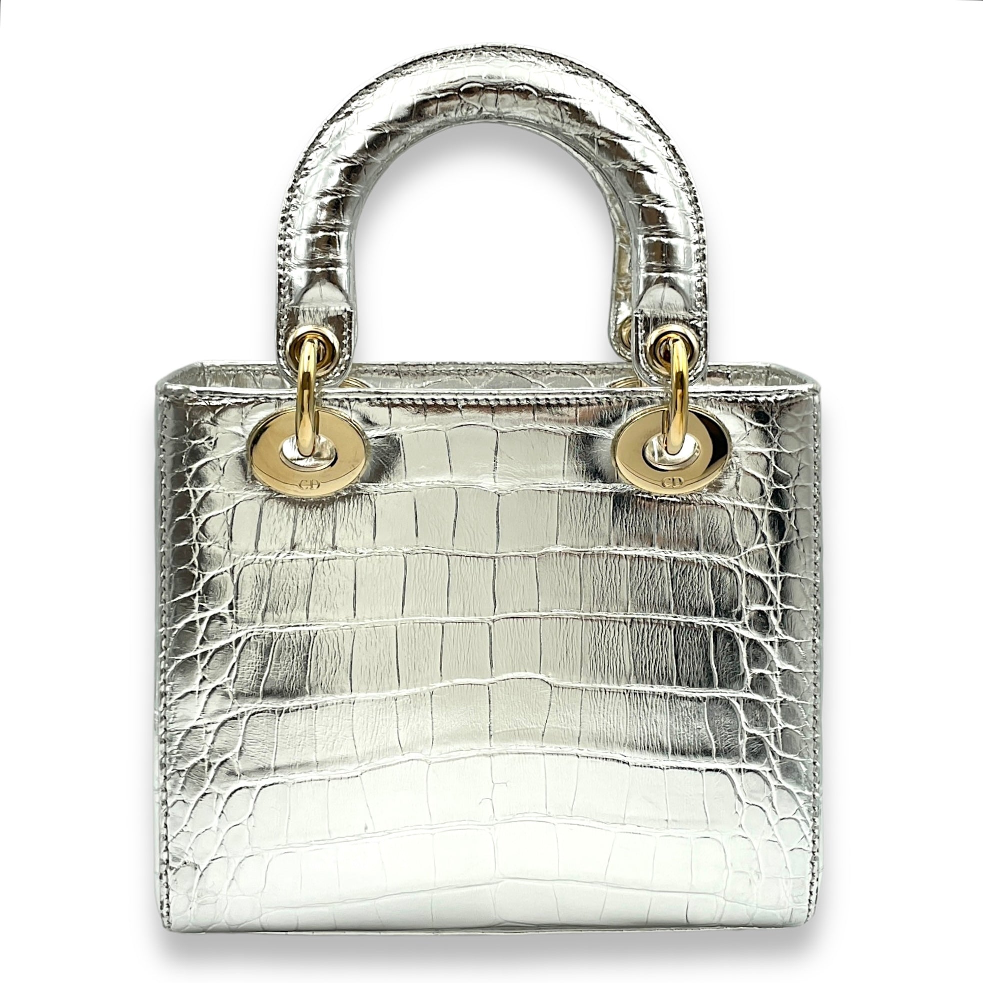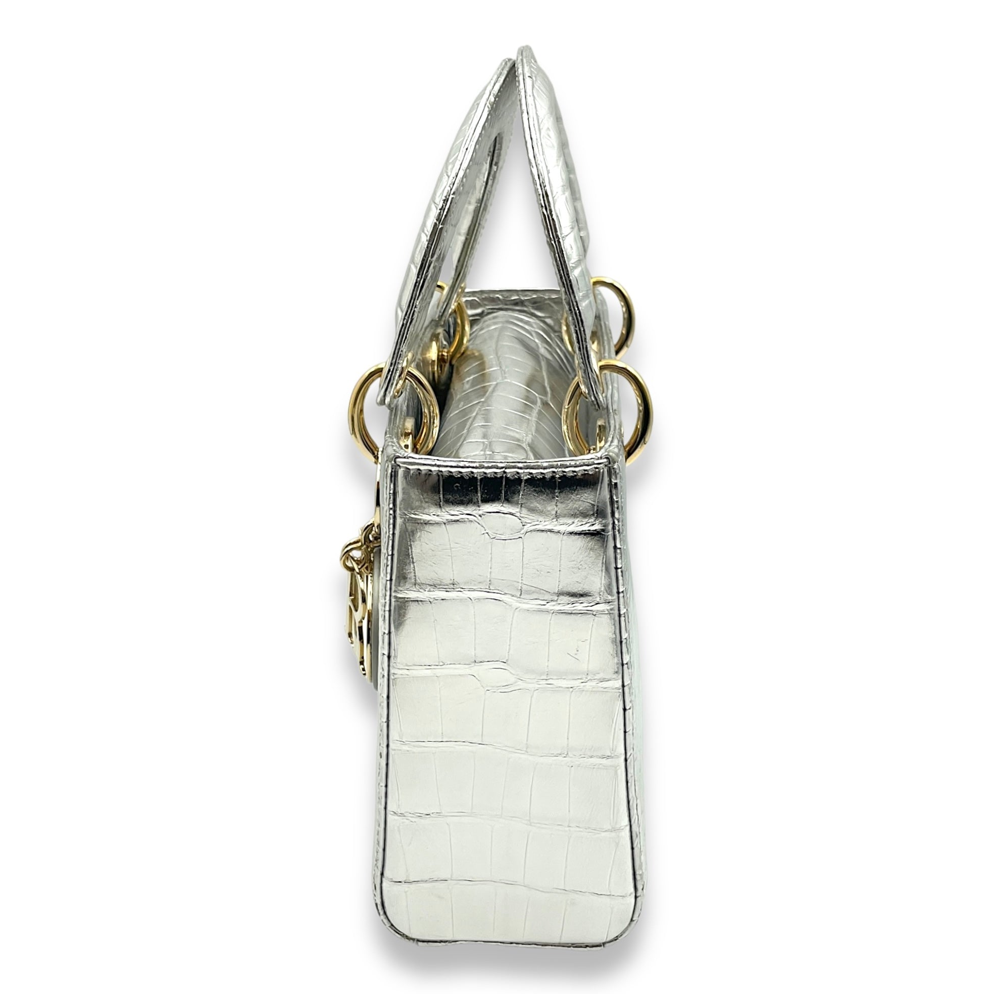 Lady Dior Small Silver Top Handle Bag in Crocodile Leather, Gold hardware