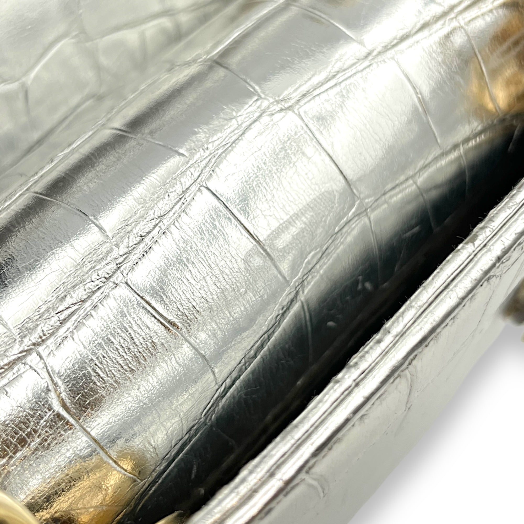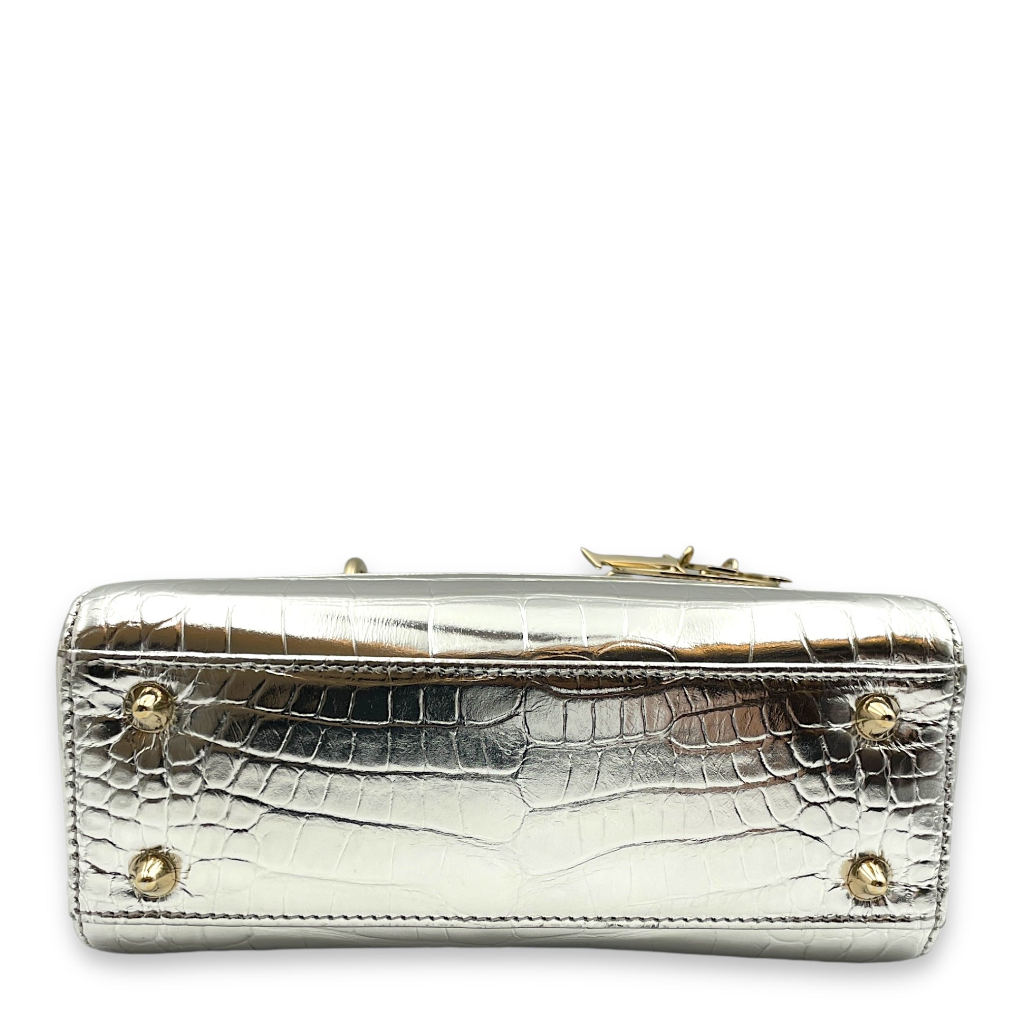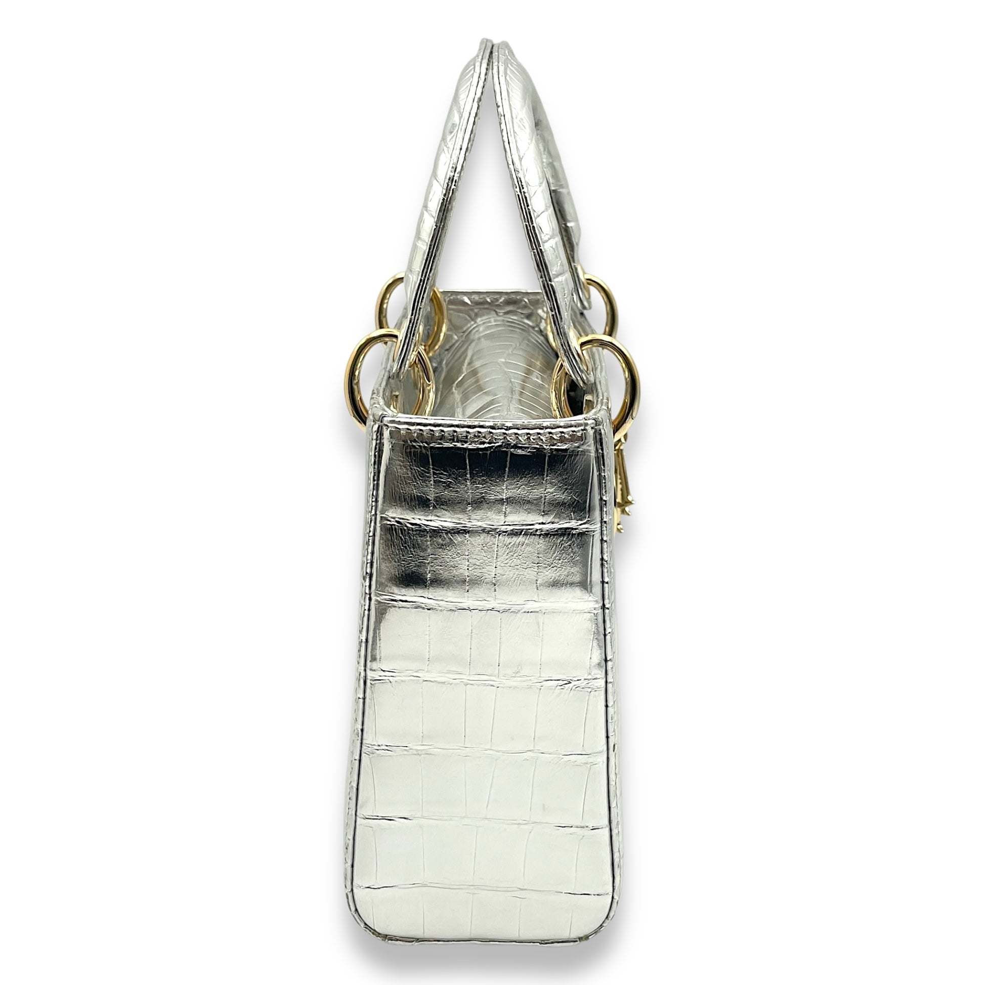 Lady Dior Small Silver Top Handle Bag in Crocodile Leather, Gold hardware