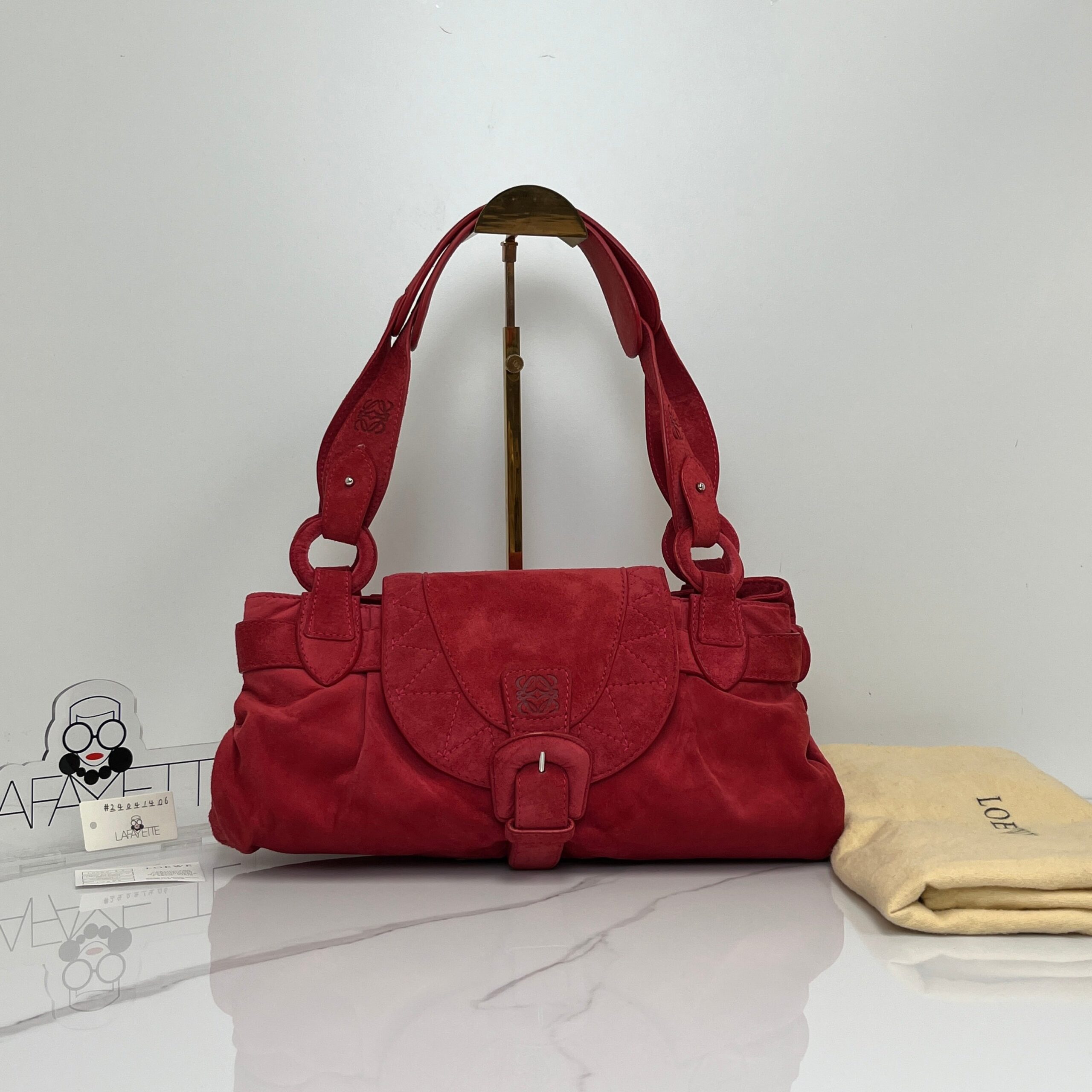 Add a splash of color to your wardrobe with the Loewe Vintage Shoulder Bag in vibrant red suede. This bag combines timeless elegance with a bold hue, making it the perfect accessory for any outfit that needs a standout touch.