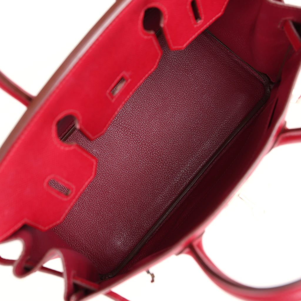 This Birkin is in Rubis epsom leather with palladium hardware and has tonal stitching, front flap, two straps with center toggle closure, clochette with lock and two keys, and double rolled handles.The interior is lined with Rubis chevre and has one zip pocket with an Hermes engraved zipper pull and an open pocket on the opposite side.Collection: N Square (2010)Origin: FranceCondition: Pre-owned; Excellent – This bag retains its shape. Moderate scratching to exposed turnlock and feet hardware. The exterior leather is clean with no signs of wear. The interior leather has minor signs of wear to base interior leather.Accompanied by: Hermes dustbag, clochette, lock, two keysMeasurements: 11.75″ width x 9.5″ height x 6″ depth; 4.25″ handle drop