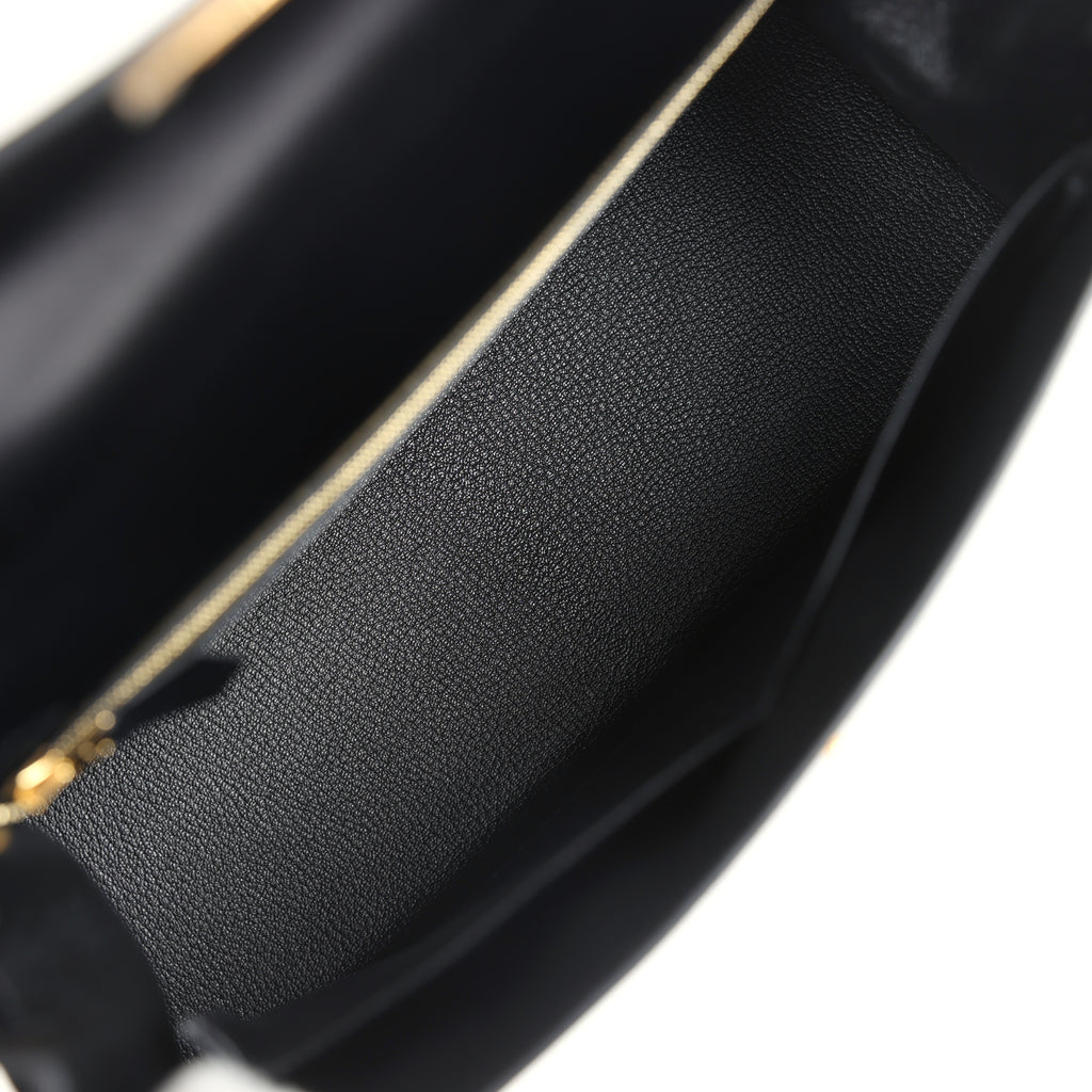 This Kelly, in the Sellier style, is of Black Box calfskin leather with gold hardware and has tonal stitching, a front toggle closure, a clochette with lock, two keys, a single rolled handle and removable shoulder strap.The interior is lined with Black chevre leather and has one zip pocket with an Hermes engraved pull and two open pockets on the opposite side.Collection: Y (2020)Origin: FranceCondition: Pre-owned; Excellent to Mint- This bag retains its shape structure. There is plastic on all the hardware except for the turnlock and the strap clasps. The exposed turnlock has some moderate scratching and the exposed shoulder strap clasps have some light hairline scratches. The hardware plaque on the front flap has some tarnishing to the rivets under the plastic. The exterior leather is mostly clean with the exception of some minor markings to the front bottom left and bottom base. The leather is clean with minimal signs of wear.Accompanied by: Hermes box, Hermes dustbag, clochette, lock, two keys, shoulder strap, carebook, rainhatMeasurements: 12.75″ width x 9″ height x 4.75″ depth; 3.5″ handle drop (16″ shoulder strap drop)