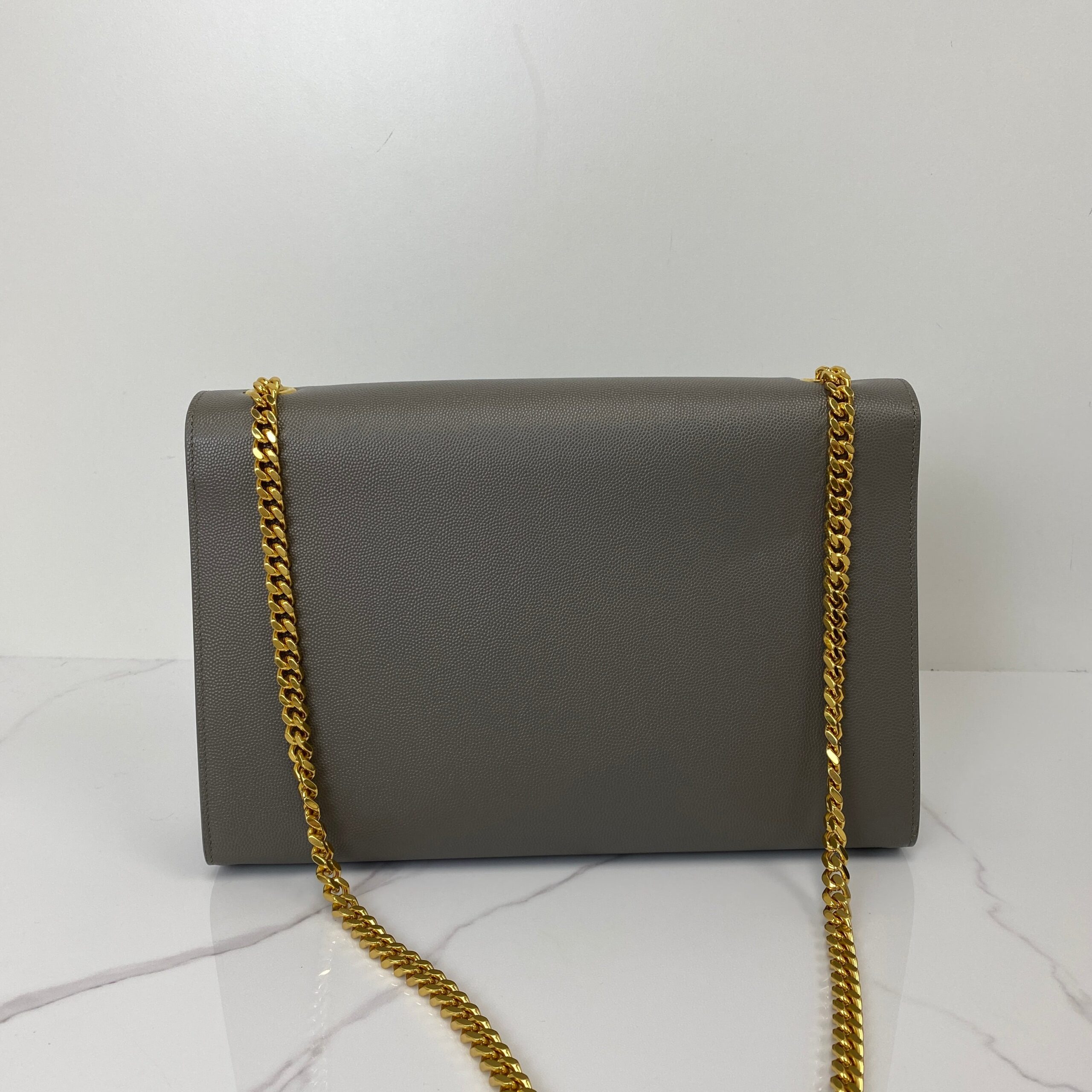 Refined, iconic, unforgettable—the Saint Laurent Kate in grey grainy calfskin blends sharp design with quiet strength. A piece that carries more than your essentials; it carries confidence.