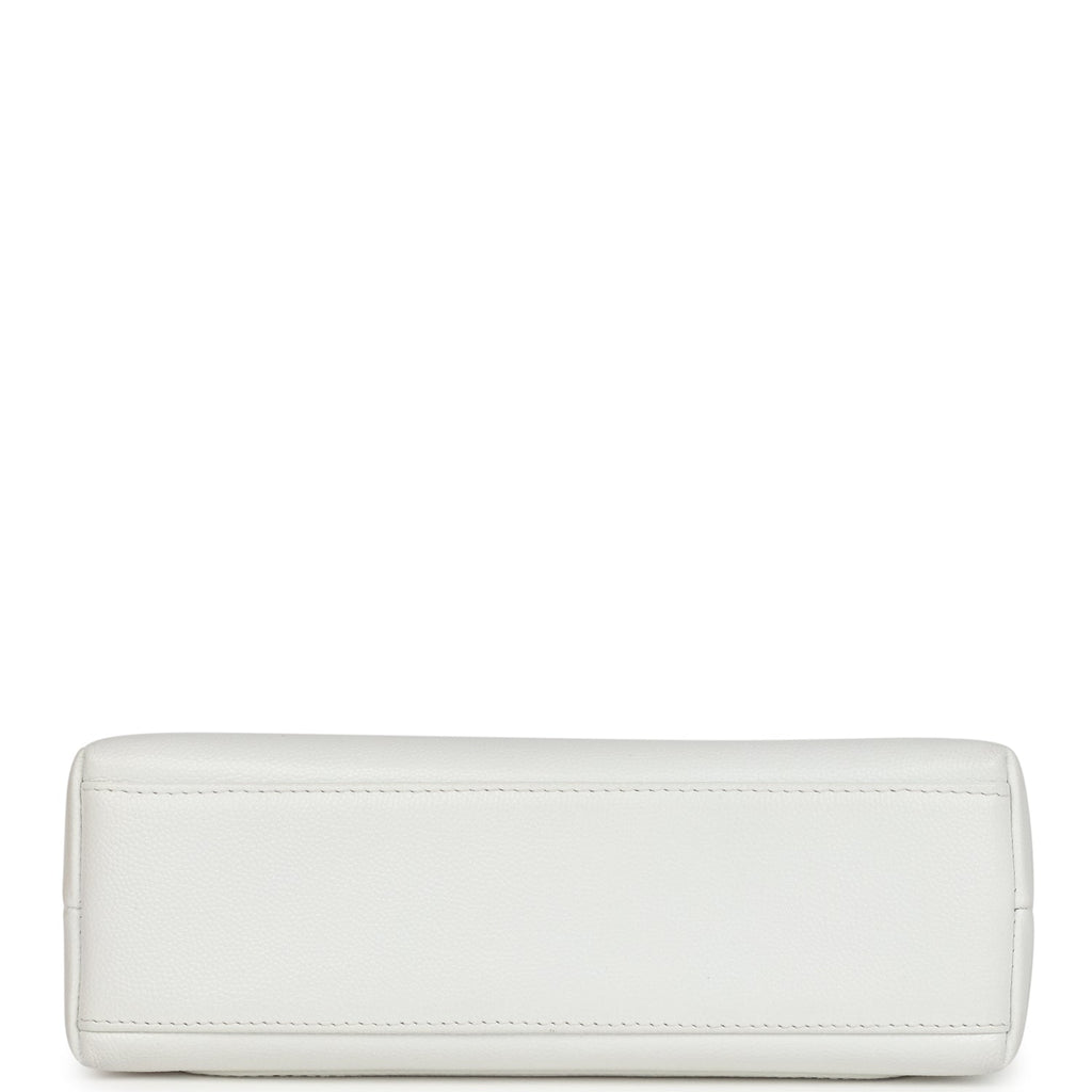 This vintage Chanel Small Top Handle Kelly is in white caviar leather with gold-tone hardware, featuring tonal stitching, has a front tab with CC turnlock closure, back exterior pocket and two flat top handles.The interior is lined in white lambskin leather and has one zip pocket on the rear wall with logo pull, and one slit pocket.Collection: 5-series (1997-1999)Origin: FranceCondition: Vintage; Excellent – This bag retains its shape structure. There is no plastic on the hardware, resulting in some light scratches to the hardware. The exterior leather is mostly clean with the exception of a small mark to the back top handle and partial yellowing to some of the stitching. The interior leather has some pressmarks and creasing all around. There is some light staining to the back wall and there is discoloration to the glue of the zipper pocket.Accompanied by: vintage Chanel dustbag, COA card, carebookMeasurements: 8” width x 5.6″ height x 27.5″ depth; 3.25″ top handle drop